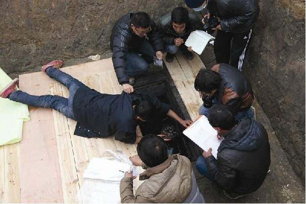 工作人员探取文物。