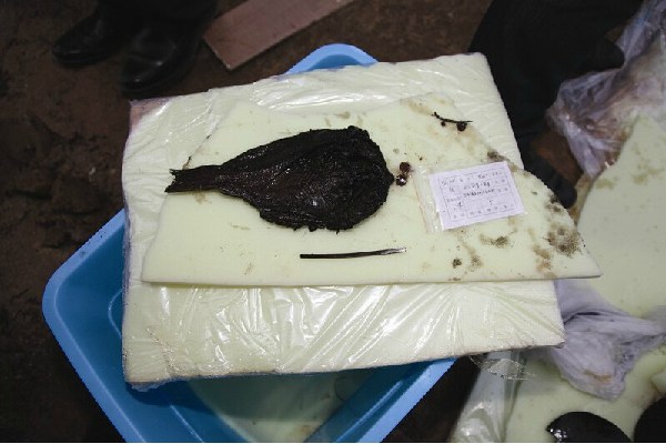 上午11时,考古人员取走椁板,看到内棺,被丝绸棺帷罩盖,棺盖南部,有一叠物品,细看是4条干鱼。看样子是野生鲫鱼,腹背剖开的都有,巴掌大小,鳞片依然,色红如鲜。
