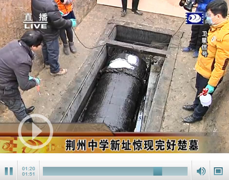 挖掘现场。这是座仅一室和南部一头箱的长方形竖穴土坑墓,加上墓道呈“甲”字形。墓道长2.93米,宽1.7米,楚墓残深3.8米。头南脚北。外一椁内一棺,楠木椁板,椁室长宽分别为3.3和1.52米,椁板四角一改本地多见的“井”字形,为方方正正。棺长宽分别为2.2和0.74米。