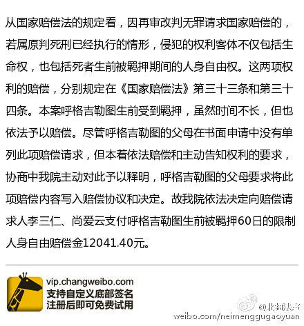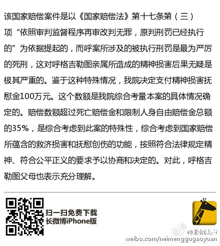 据内蒙古自治区高院官方微博@北疆法声消息,内蒙古高院对呼格吉勒图案作出国家赔偿决定。呼格吉勒图再审改判无罪案,呼格吉勒图父母李三仁、尚爱云于2014年12月25日向内蒙古高院提出了国家赔偿申请,内蒙古高院于同日立案,并于12月30日依法作出国家赔偿决定,决定支付李三仁、尚爱云国家赔偿金共计2059621.40元。该决定已于12月31日送达。