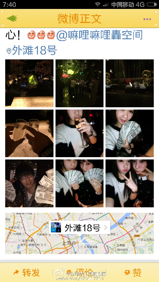 随后,网友在微博上找到了一位微博名为“超级大傻冒—沈小姐”的博主,其当晚稍早些时候在微博上发表言论称:“又是一年要过去啦……哈哈~酒吧跨年,妥妥滴、热闹滴很呀,有钱,任性;撒钱,开心!”其还在微博中展示了印有“M18”“100”字样的酒吧代金券,还@了外滩十八号这个地址。