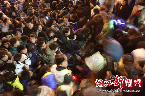 记者意识到危险性在增大想要抽身离开,但因为人群太过拥挤,使得前进和后退都变得极其困难。23:30,开始有女人尖叫和孩子的啼哭声,不安的情绪在迅速蔓延。记者也开始有不祥的预感,在此时打给朋友的电话里,他直言感觉很危险,担心发生踩踏事故。挂完电话,他看到了2米外的一个垃圾筒,后涌来的人群也正好把他涌到了附近,在努力踩上之后,又奋力攀上了近两米高的围墙。上去之后依然是拥挤不动的人潮,他只能待在墙头,在和旁边的几个年轻人一起拉上几个人后,墙头处也再无一寸容身之地。