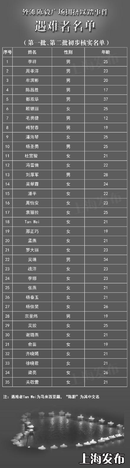 根据上海市政府新闻办公室官方微博“上海发布”最新消息,第二批3位遇难者名单也已初步核实,还有1位遇难者身份仍待核实。