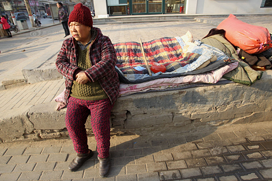 2015年01月08日,郑州,为了儿子来接她的“约定”,73岁的罗风老人,“驻守”在郑州市东风路与丰乐路交叉口西北角的台阶上,已有近一年时间。一位匿名读者给记者打来电话说,听说老人的儿子在附近网吧。