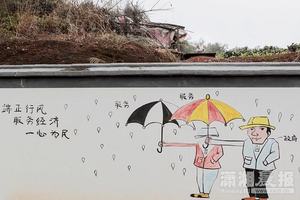 1月14日,潇湘晨报记者在长沙市一个工地围挡墙上看到了一组揭露腐败的漫画。漫画的内容多为讽刺一些官员不正当的获利行为。 这样类似的漫画一共有33幅,漫画没有署名没有日期,也不知道是何人的手笔。据悉,长沙县城管执法局广告亮化办负责人表示,由于漫画内容在表达形式上过于直接,内容过于负能量,将对内容进行重新喷涂。图为工地围挡墙上的反腐漫画。
