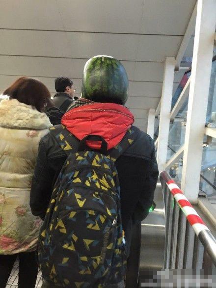 据乘客吴女士称,在昨天晚上乘2号线一趟列车时看到了"西瓜哥"。"当时他头上戴着西瓜皮,手中拿着两个玻璃酒瓶,身上有酒气。看着有些吓人。"