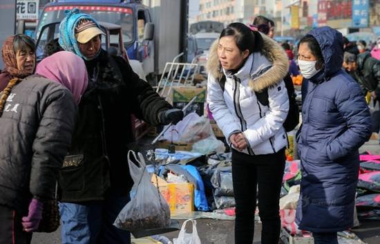 沈阳街头小贩夏俊峰的遗孀张晶今年41岁,离农历新年还有一个多月,张晶踏上从北京开往沈阳的动车,她前往辽宁省本溪市本溪满族自治县沟口镇的三姐家为新开的网店收购东北山货。图为在东北的乡村集市上,张晶从摊贩手中购买新鲜山货为自己的网店进货。