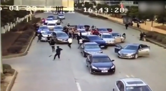 戏剧性的是,不到一分钟,大约10多名男子手持凶器赶到现场为汽车被砸的一方解围,双方在马路上互砍,现场一片混乱,吓得途经此地的行人纷纷躲避。