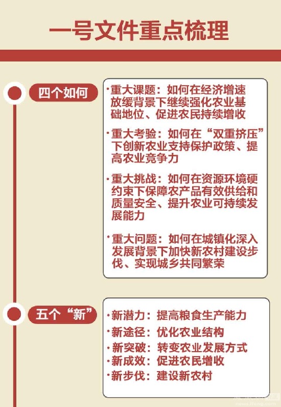改,改革创新,这是贯穿整个一号文件的一个字。从具体部署看,其中若干项有望在今年取得新突破——构建新型农业经营体系,农村集体产权、土地、金融等体制改革,水利林业改革,种业科研成果权益分配改革,涉农转移支付制度、农业补贴制度改革,等等。
