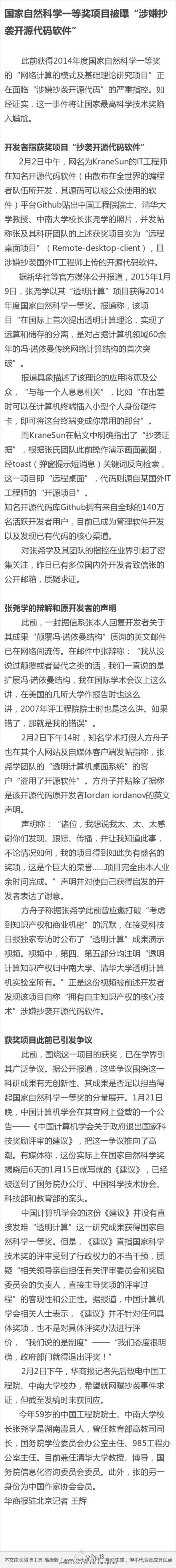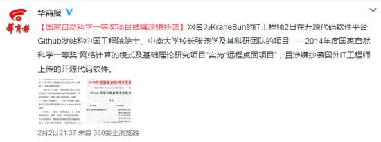 @华商报:【国家自然科学一等奖项目被曝涉嫌抄袭】网名为KraneSun的lT工程师2日在开源代码软件平台Github发帖称中国工程院院士、中南大学校长张尧学及其科研团队的项目——2014年度国家自然科学一等奖“网络计算的模式及基础理论研究项目”实为“远程桌面项目”,且涉嫌抄袭国外lT工程师上传的开源代码软件。详文见下: