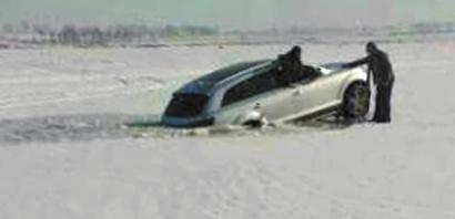 事后,他从一位当地老乡口中得知,当时,出事车快速开过来,一个急刹车,漂移出一段距离后停了下来,突然后轮轧开冰面,开始往下沉,车内一男一女和一个孩子陆续从车窗爬出来逃生,性命是保住了,可是一辆价值约百万的豪车沉下去了。