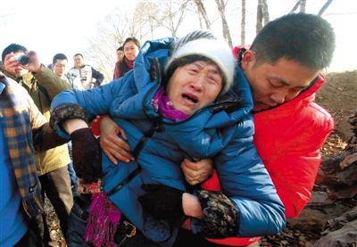 资料图:恸哭穿红色羽绒服的三儿子庆格勒图扶住瘫软的母亲尚爱云。