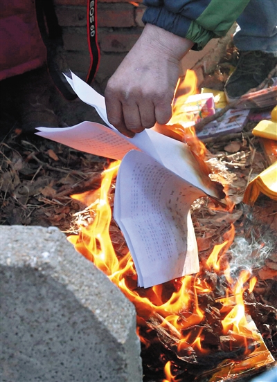 资料图:告慰儿子坟前,李三仁点燃了再审判决书复印件。