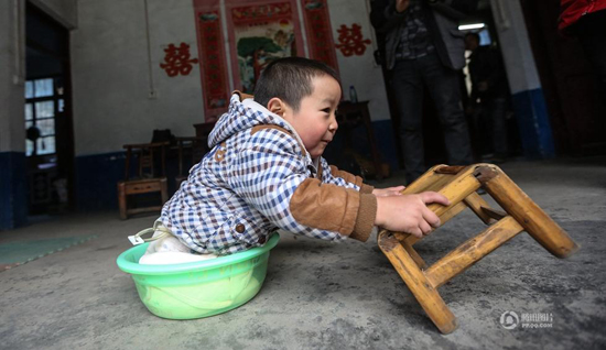 因为很早就不能正常行走,小峰利用自己的手发明了很多“代步工具”。张喜玉回忆,有一天孩子突然拉着她说:“妈妈、妈妈,你看我会走了。”张喜玉回头一看,孩子坐在脸盆里,双手抱着木板凳,在地上“跑”起来,那时候张喜玉内心五味杂陈。