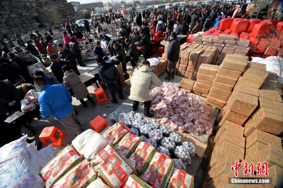 2月4日,河北省永年县广府镇东街村党支部书记宋福如投入220多万元为全村人置办年货,使全村的2880名村民每人领到了一份年货,喜迎新春佳节的到来。