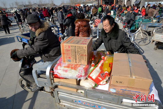 河北省永年县广府镇东街村党支部书记宋福如投入220多万元为全村人置办年货。