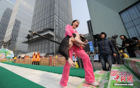 2月8日,一位美女将花猪抱上终点。当日,一场抱花猪冰面赛跑活动在湖南长沙举行,挑战者需在2分钟内抱上花猪穿越20.15米的冰雪赛道,且在终点亲吻花猪方可获胜,并获得花猪年货。