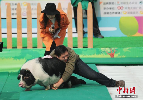长沙举行冰面抱花猪赛跑 美女抱猪亲吻获年货