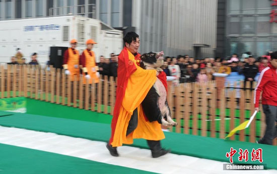 长沙举行冰面抱花猪赛跑 美女抱猪亲吻获年货