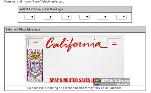 但要达到照片中蓝底白字的效果是不可能的,因为目前加州车管局提供的10种特殊号牌样式都必须带有“california”字样。同时,这种号牌最多只能有6位。