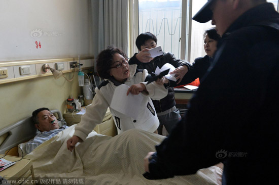 2月10日下午2点10分,执行法官与法警们一同来到京煤医院住院楼,陈某躺在骨科病房34床上,5名家属在其身边或坐或站。看到法官进入,家属们情绪激动,与法官们撕扯起来。
