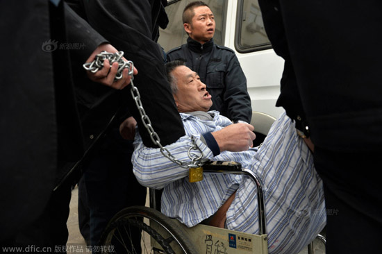 宣读期间,陈某情绪激动,不断地挣扎,并喊着:“我是受害者,找我的代理人。”宣读完执行词后,6名法警一同将陈某从病床上架起,将他放在轮椅上推出病房。