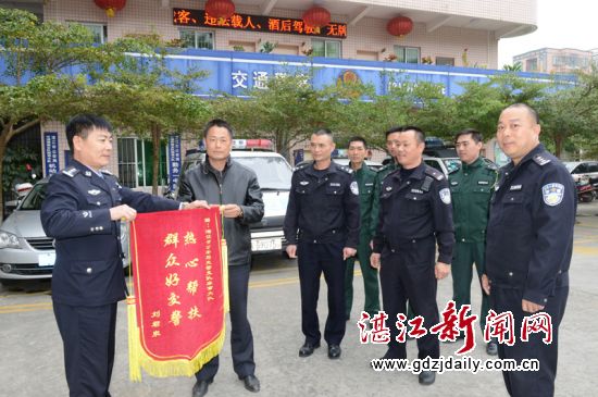 湛江新闻网讯: 2月11日,市民刘君泉带着一面印有“热心帮扶群众好交警”的锦旗送到交警支队麻章大队姜红扬大队长、梁广教导员手中,感谢交警麻章大队民警、协管员热情帮助三位高龄老人搭上回家的客车,还主动为三位老人垫付了车费。 1月29日上午,交警麻章大队一中队民警陈捷、郑海韬带领协勤叶云、陈景平、冯志民驾驶警用汽车、警摩巡逻执勤。巡至麻章南亚丽都路段时,民警、协勤人员发现三位年近八旬的老奶奶站在路边,看样子很着急、很无奈。考虑到三位老人岁数已大,却在繁忙的车流路边逗留非常危险,于是立即靠边停车,向三位老奶奶了解情况。原来,这三位老奶奶是想乘车回遂溪。但由于这里不是客车上落站,途经的客车都不肯停车,她们无奈地在路边摇手着急。执勤民警、协警了解情况后,遂安慰三位老人,劝她们不用着急,先转移到安全地带,再为她们想办法解决回家之忧。