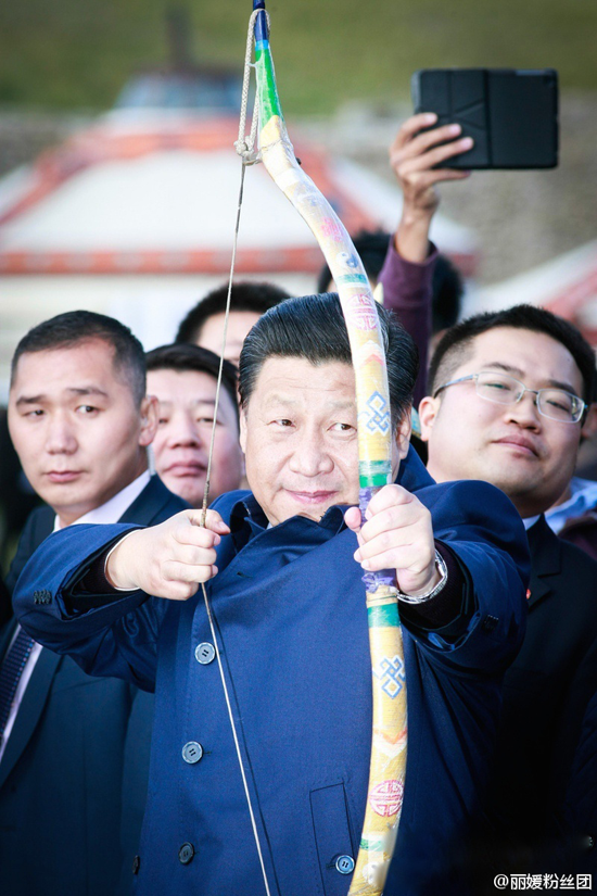 青春洋溢的姑娘小伙跳起蒙古民间舞蹈。魁梧英勇的摔跤手跨着大步,进入场内捉对搏斗,进行力量和技巧的较量。雄姿英发的骑手扬鞭策马,上下翻滚、左右腾挪,尽显马背上民族的热情奔放。沉着冷静的射箭手凝神屏气,箭无虚发。习近平走到射箭手中间,同他们亲切交谈,弯弓搭箭。额勒贝格道尔吉和夫人邀请习近平和彭丽媛为比赛优胜者颁奖。