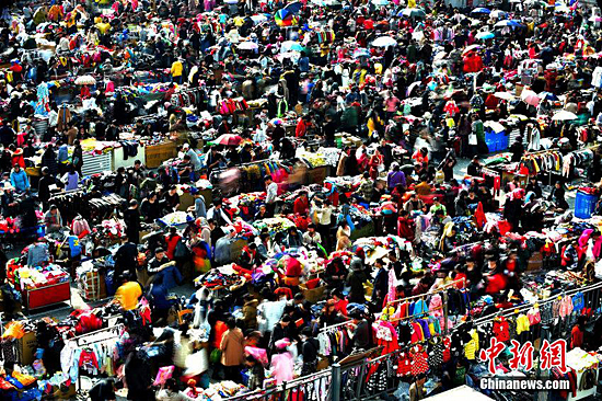 2月14日,杭州某服装市场外的摊位上人山人海,商户们忙着在年前低价抛售库存,进行最后的大甩货,吸引了大批淘客赶来淘宝。据了解,除了室外的摊位外,各个市场里也都开始了甩货处理。除个别市场在2月16日休市以外,其他服装市场在2月18日休市。