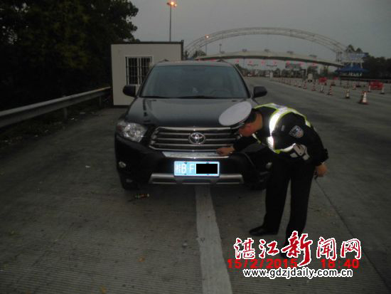 湛江新闻网讯:2015年2月15日16时30分左右,高速公路粤西春运点值班民警冯平接到市局指挥中心指令称,当天中午在茂名有一辆车牌为桂BFP228的黑色丰田小客车被盗,可能经过粤西春运检查点,要求设卡查扣。接到指令后,交警支队高速一大队治安中队长冯平马上带领副中队长林望雨、民警梁木恒马上布控,将收费站六车道改为两车道,人为增加车道的车流量。17时40分左右,民警发现嫌疑车辆进入收费通道,于是拦停前后车辆后,将目标车辆堵住、动弹不得,并将车上的嫌疑人控制、迅速带离,恢复正常交通秩序。