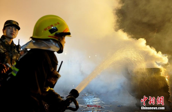 2月19日凌晨,因烧香祈福人多,香炉温度太高,消防官兵紧急冷却。当日,峨眉山景区报国寺迎来上万民众撞钟、烧香祈福迎接羊年的到来。中新社发 刘忠俊 摄