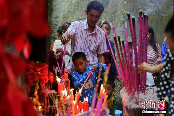 2月19日农历大年初一,位于海南省万宁市的“海南第一山”东山岭景区迎来春节游客祈福高峰。图为游客敬香祈福。中新社发 李慧思 摄