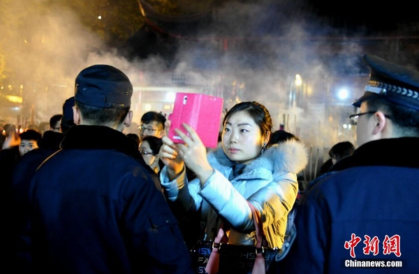 2月19日凌晨,因祈福人多,警察临时对进入报国寺大殿的人数进行限制。当日,峨眉山景区报国寺迎来上万民众撞钟、烧香祈福迎接羊年到来。中新社发 刘忠俊 摄