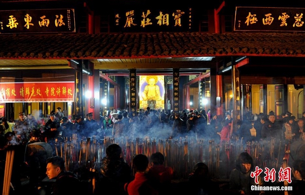 2月19日凌晨,上万民众烧香祈福。当日,峨眉山景区报国寺迎来上万民众撞钟、烧香祈福迎接羊年的到来。中新社发 刘忠俊 摄