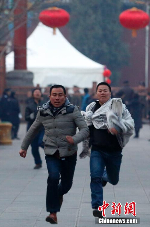 2月19日,农历大年初一,千余北京市民来到雍和宫,争烧新年头香。图为市民奔跑抢烧新年头香。中新社发 韩海丹 摄