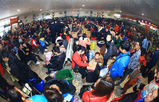 从2月22日大年初四开始,全国公路、铁路进入节后客流高峰。据公安部交管局研判,从大年初五开始,各地将迎节后返程出行高峰。图为2015年2月22日,湖南衡阳,湖南省衡阳市火车站迎来春节后第一个出行高峰。为满足旅客出行需要,该站当日增开了4趟开往广州的始发临客。