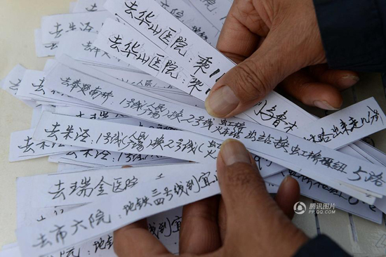 为了指路更有“底气”,提高成功率,张富宏还特地制作了数百张小纸条,上面写满了抵达上海各大医院、旅游景点等内容的路线,遇到相应的问路者就随手送给对方一张,有时也会根据问路人的实际情况,现场写下详细的路线。图为张富宏写的线路小纸条,上面记录着各大医院及旅游景点等信息。