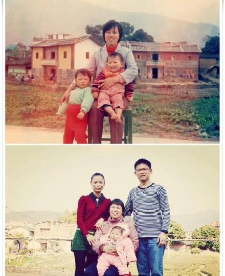 博主叫陈鹏辉,他告诉记者,这张照片是由两张照片合成,都是他的家人。左边的照片是27年前(1988年),他母亲抱着他和姐姐在乡下大姨家的顶楼拍的。右边的照片则是他们今年大年初三在老地方拍的。