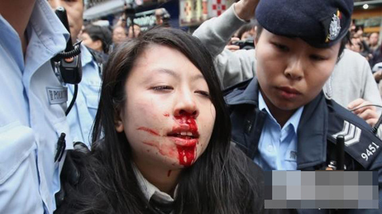 反水货游行演变为激烈冲突。期间一名长发女示威者口鼻流血受伤,由女警带走,现场消息指她与男友一同被捕。