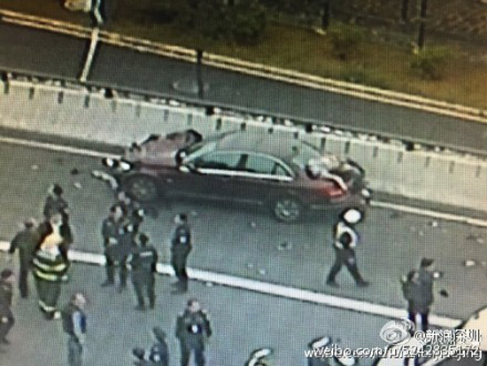 当时有十几人躺在地上,其中老人居多,部分被撞至楼下。记者在现场看到,十几名警员及相关人员已封锁现场取证,奔驰车己撞毁,车旁摆放一顶女士帽子,及一个女士Lv包。车四周散落十几双鞋子,其中包括两双童鞋。图为事发现场。