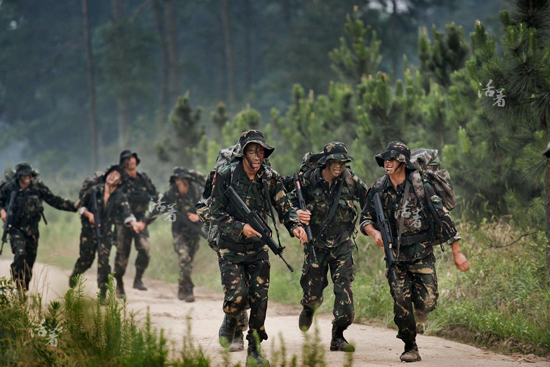 队员们背着25公斤重的背囊在乡间小路上连续急行军24小时,成绩落后的队员要受到惩罚。小组的队员们相互搀扶着冲过终点,筋疲力竭。