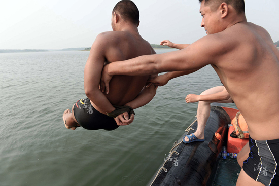 上一期集训的6号队员李兴(右)如今成为这期集训的教员,他将这期集训的6号队员(左)捆绑住手脚后扔进水中,进行水中求生课目训练。“今天的无情折磨,是为了让你们在明天的战场上活着!”教员大吼道。
