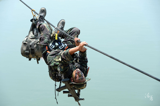 一名队员通过缆绳横渡过水面,向“敌后”进行武装渗透。无论多艰险的道路,也阻挡不了战士们向前的脚步。