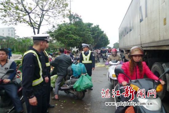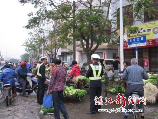 一连三天,每天早上6时多,谢海云大队长不顾近段时间交通整治带来的身体疲惫,率队亲临人民大道东与环市东路交汇处农贸蔬菜交易点进行实地走访调研。经了解,原本位于廉江市中心市场附近的农贸蔬菜交易点,因严重阻塞中心城区道路现搬迁到人民大道东与环市东路交汇处;而环市东路是廉江市分流省道287线大型客货车途经广西的主要通道,日常交通密集繁忙,虽能有效缓解了我市廉江大道的交通压力,但该路段附近南有城南汽车站北有大型水果批发市场以及销售钢材门市部十多间,每天途经的重大型货运车近300辆,中短途客运车200多辆。由于该农贸蔬菜交易点经营很不规范,占道经营乱摆乱卖等“六乱”问题极为突出,严重阻塞交通,致使城南汽车站的中短途客车及部分大重型货运车绕道市区新兴路、中山三、四路等中心主干道穿梭通行,给中心市区交通带来极大压力,严重影响周边居民正常生活和车辆通行。且该农贸蔬菜交易点经营高峰时段在凌晨01时至早上09时,下半夜途经的两广重大型长途货运车,司机极容易出现疲劳驾驶导致精神不集中状况,给该处占道摆卖群众的生命安全带来极大的交通安全隐患。