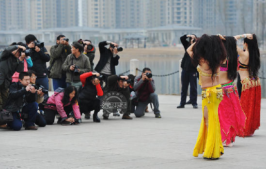 3月8日,山西省太原市汾河公园南中环桥处,30余名肚皮舞爱好者跳肚皮舞。