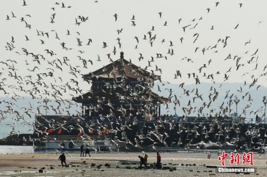 山东省青岛市栈桥附近的海鸥开始大密度集结巡游,为即将飞回西伯利亚做着迁徙前的准备。据了解,青岛市民挽留海鸥20年,数量由当年的两千余只增至十多万只,每年三四月份,大批海鸥开始向黑龙江和西伯利亚繁殖地迁徙,行前集结觅食,场面蔚为壮观。3月10日,栈桥退大潮,准备迁徙的海鸥开始集群练飞觅食。