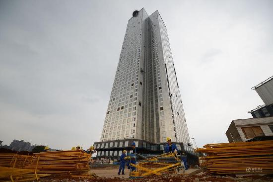 3月17日,长沙一栋名叫“小天城”的57层高楼正在进行最后的装修扫尾工作。据施工方远大可建安装部部长何优贤介绍,该大楼主体结构均由钢架构成,材料工厂预制达93%,由1200位工人昼夜开工拼接,耗时19天完工,除雨雪天停工,有效工期仅12天。该大楼可抗击9级地震。中新社发 杨华峰 摄