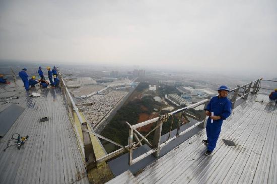 楼顶工作人员正在进行最后的装修扫尾工作。中新社发 杨华峰 摄