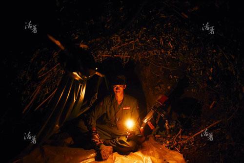 缅甸同盟军最前线,守夜的士兵钻进紧挨着一块大石头的帐篷里,青涩的面庞下,却透着刚毅的目光。
