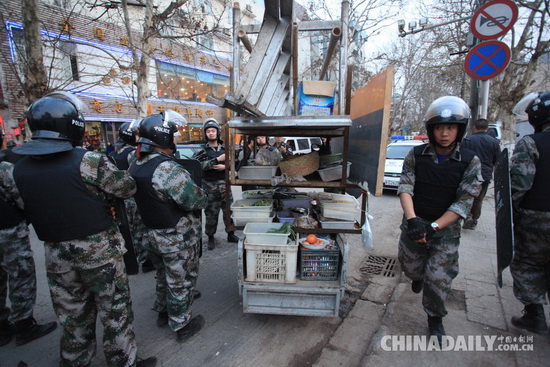 23日下午,泉山区城管局联合市城管局一大队、二大队分别对富国街、诸达北巷、少华街、徐医附院东门、纺织东路北路口等市中心长期占道经营的“钉子户”摊点进行集中整治。(图片来源:CFP)